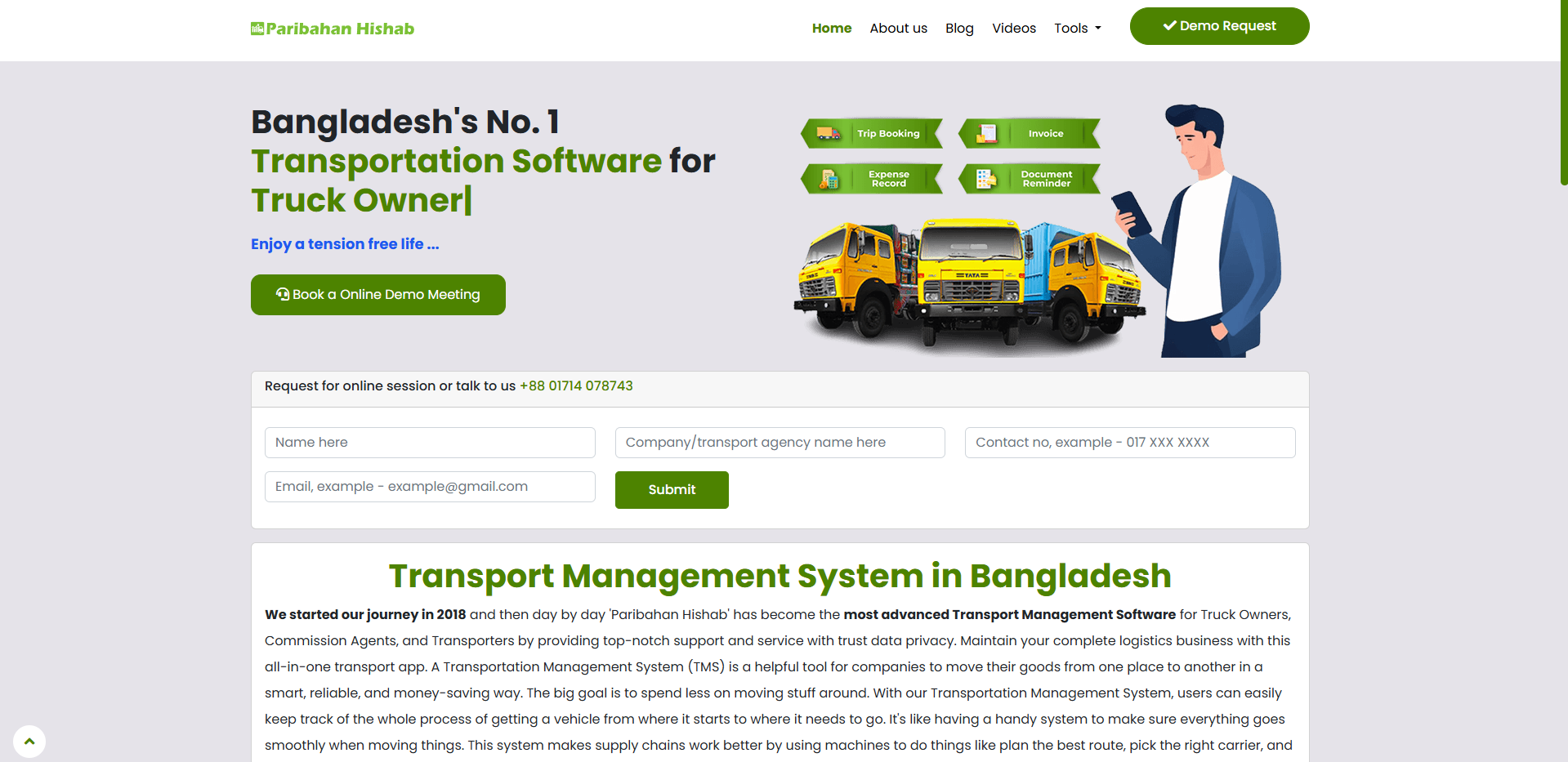 Paribahan Hishab started its journey in 2018 and has since become Bangladesh's leading Transportation Management Software (TMS). Trusted by truck owners, commission agents, and transporters, we offer an all-in-one solution to efficiently manage logistics operations. Our goal is to help businesses reduce costs, streamline processes, and enhance efficiency in their supply chain management.